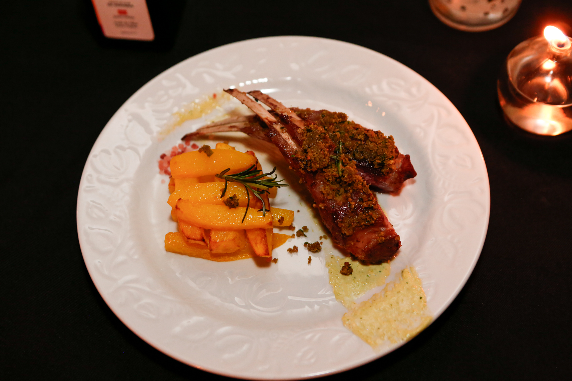 - Para servir, risque o prato com aioli, coloque as batatas em uma lateral e o carré sobre as batatas.